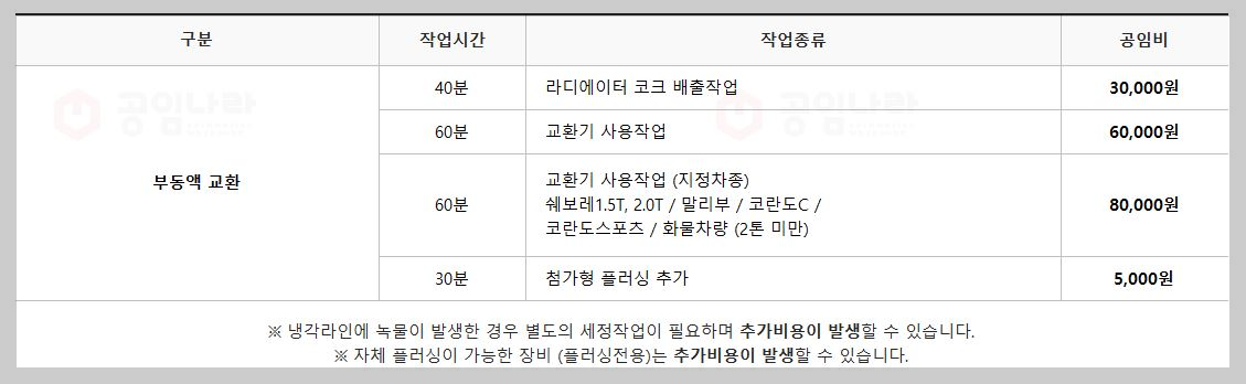 냉각수, 엔진오일, 변속기 오일, 파워스티어링 오일 등이 부동액에 해당됩니다.